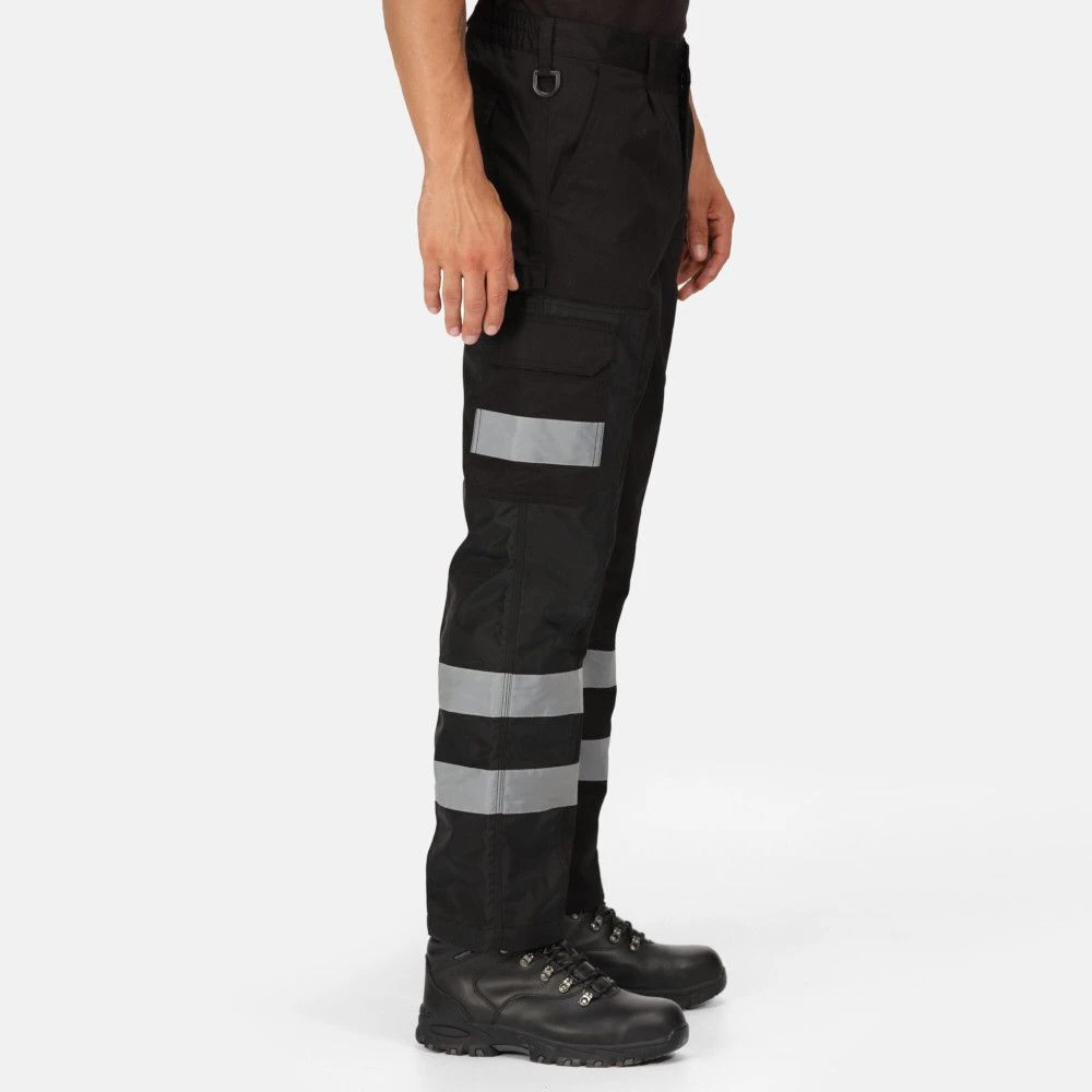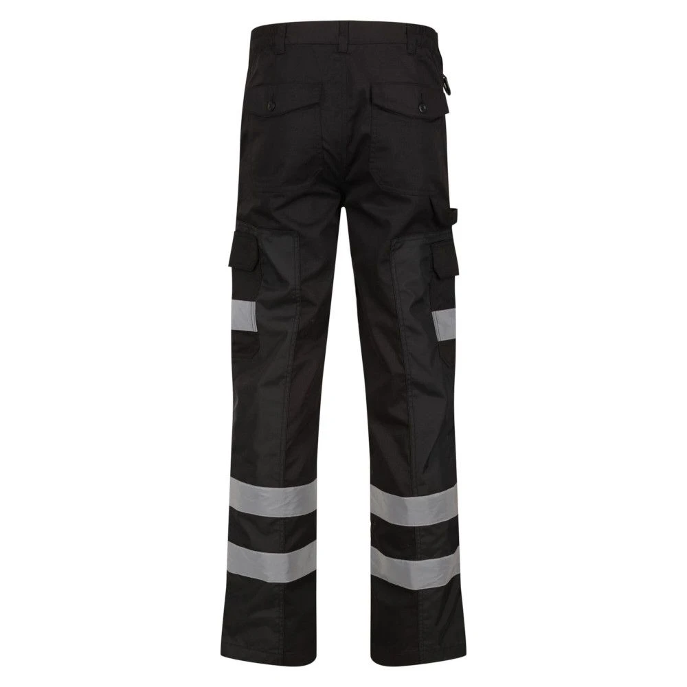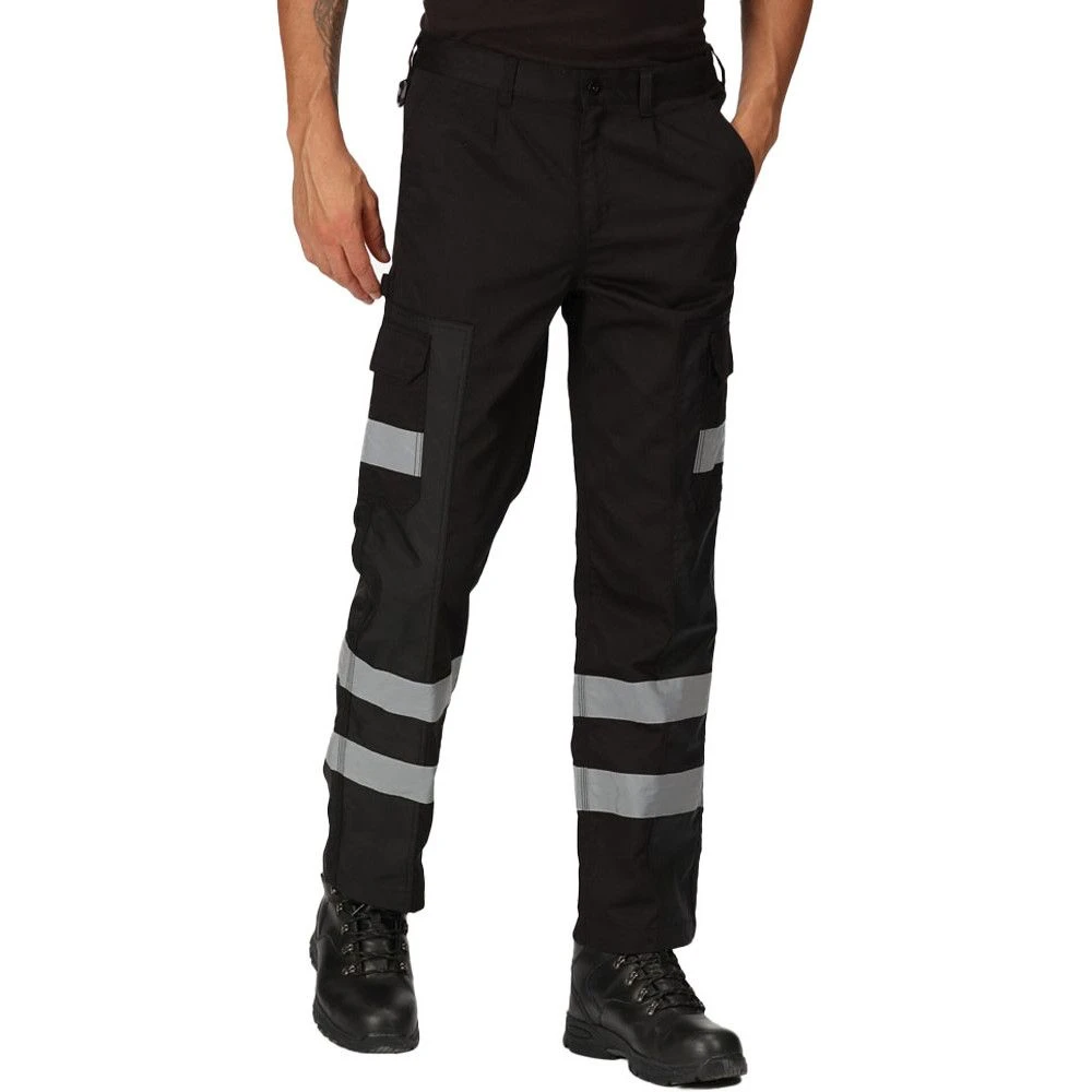 The garment features tough ballistic nylon panels in strategic areas that resist abrasions, offering better protection against sharp objects. The crotch seam is reinforced for added durability, and reflective elements enhance visibility. It comes with multiple pockets, including two side pockets, two cargo pockets, and two rear pockets. The side elastic waist provides a comfortable fit, while a hammer loop adds convenience.