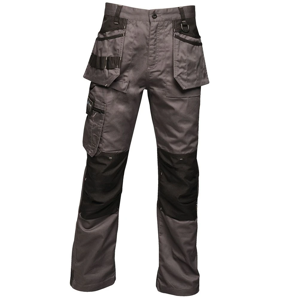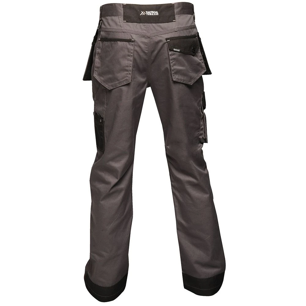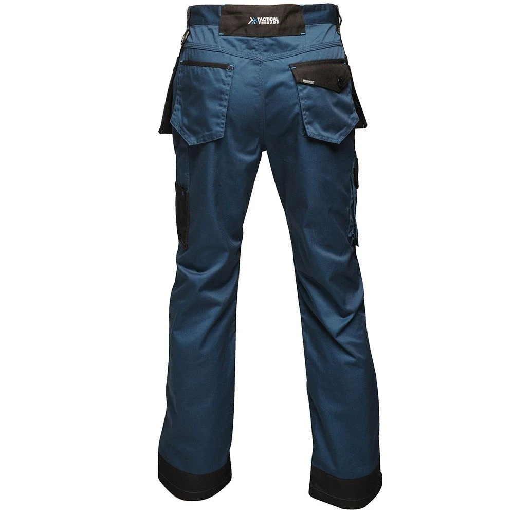 - 2 Front pockets 1 side cargo pocket button fasten, 2 rear pockets. Side leg ruler pocket. D-ring attachment.
